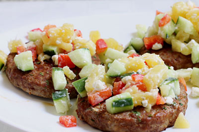 We just love DAY 5’s Turkey Burgers with Pineapple Cucumber Salsa. Serve the brugers on a bun topped with salsa or on a plate – both are delicious!