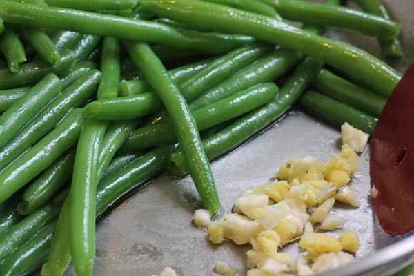 Sauté the green beans and then push them over to the side of the pan to add the garlic and grated ginger. Add a little additional oil if necessary.