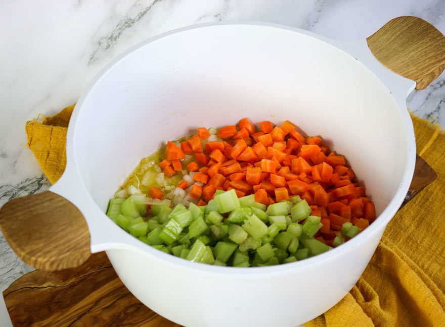 Add chopped onion, carrot, and celery and cook for another 4-5 minutes, stirring occasionally, or until vegetables are soft and tender. We always lightly salt and pepper