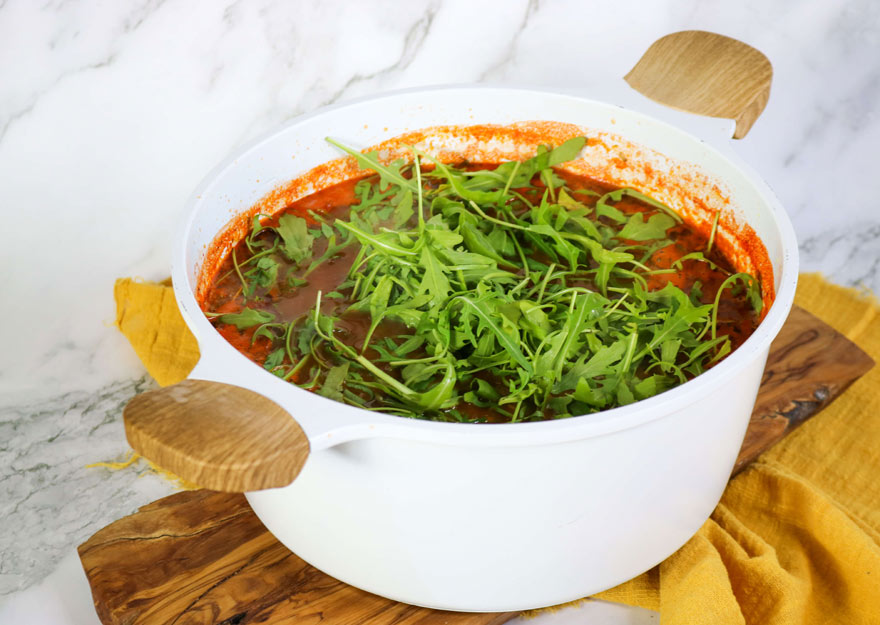 5. Add arugula and additional vegetable broth, if needed, and stir to combine. Season with additional salt and pepper, to taste. Cook for 2-3 minutes or until arugula begins to wilt.